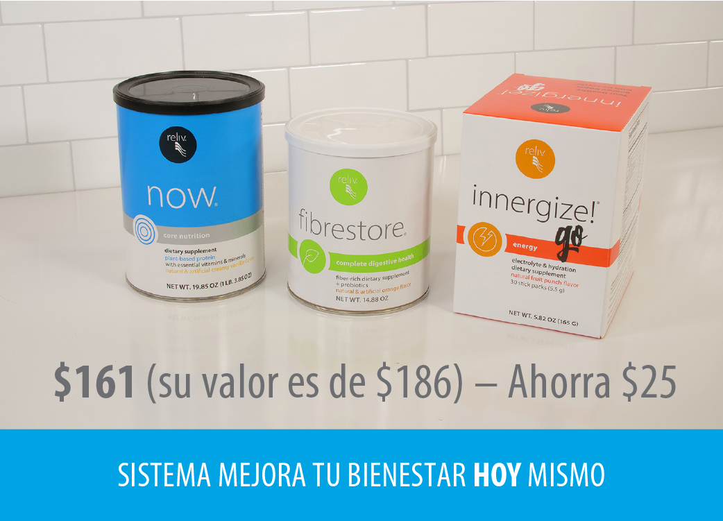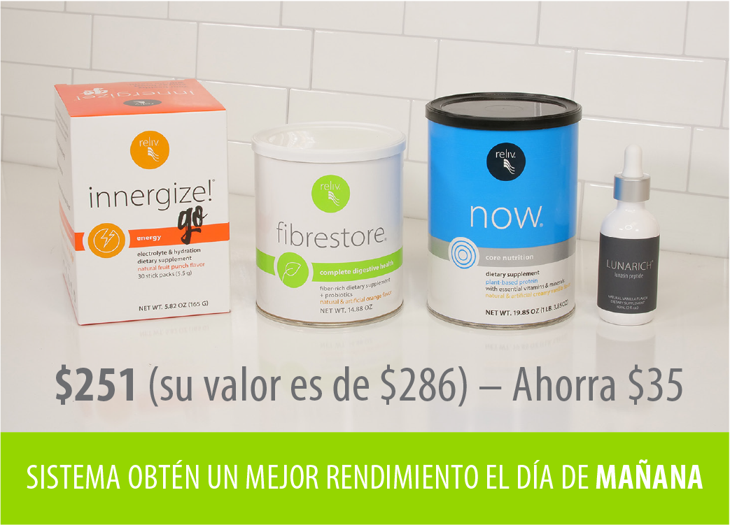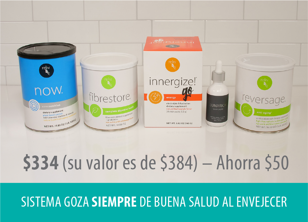 Los Sistemas de Reliv para un Envejecimiento Saludable incluyen productos con beneficios complementarios estratégicamente combinados para optimizar el proceso del envejecimiento. No importa en qué etapa estés en tu proceso de lograr un envejecimiento saludable, los sistemas de Reliv combinan la nutrición basada en la ciencia con el poder de la naturaleza para ofrecerte soluciones que te ayuden a mejorar tu bienestar hoy mismo, a obtener un mejor rendimiento el día de mañana y gozar siempre de buena salud al envejecer. Es hora de dejar de preocuparte tanto por el envejecimiento y concentrarte más en disfrutar de la vida.